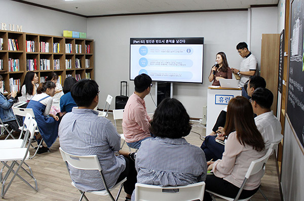 한 달에 한 권씩, 직원 모두가 읽을 책을 선정합니다. 토론의 자리를 만들고 자유롭게 책에 대해 이야기를 나눕니다. 자신의 생각을 정리하고 말로 표현하고 글로 작성하면서 책의 지식을 자기 것으로 만드는 방법을 알아갑니다. 독서를 통해 회사가 추구하는 가치와 직원의 비전을 함께 공유합니다. 활기찬 토론 문화와 직원 주도의 진행 방식으로 팀웍을 높여 협업을 강화하고 회사에 대한 주인의식을 함양하고 있습니다.